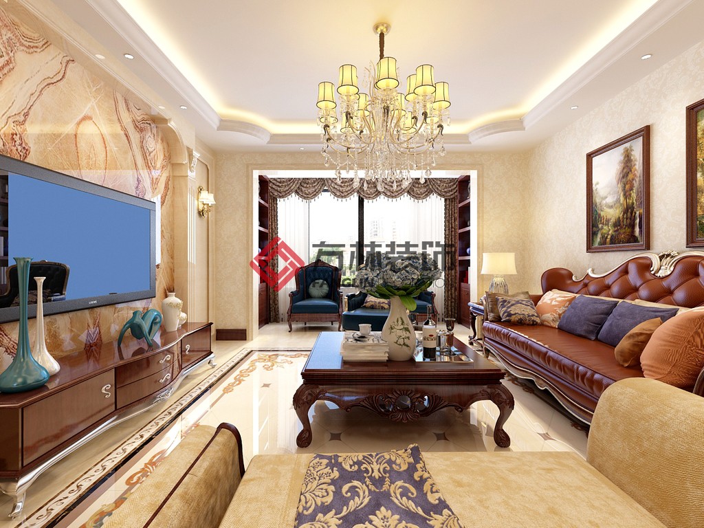 繁復的飾線布滿了客廳,搭配大氣的金伯爵電視組合柜,在華麗的水晶吊燈襯托下,盡顯經典歐式的富麗堂皇。置身其中,仿佛穿越到18世紀的歐洲